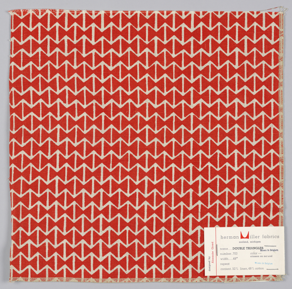 Sample, Double Triangles; Designed by Alexander Hayden Girard (American, 1907–1993); Produced by Herman Miller Furniture Company (United States); Manufactured by American Art Textile Printing Company, Inc.; Belgium; 52% linen, 48% cotton; Warp x Weft: 30.5 x 31 cm (12 x 12 3/16 in.); Gift of Alexander H. Girard; 1969-165-159
