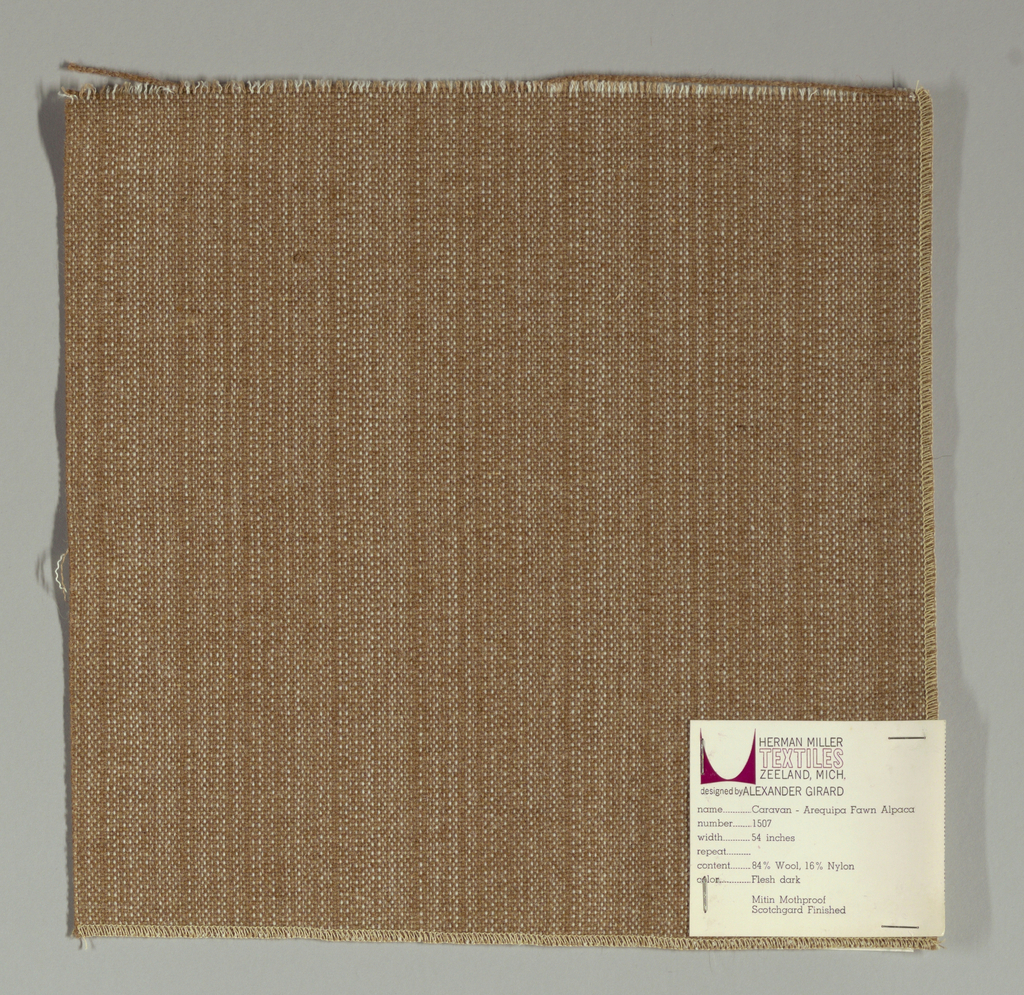 This is a Sample. It was designed by Alexander Hayden Girard and manufactured by Moss Rose Mfg. Co and produced by Herman Miller Textiles. It is dated 1960 and we acquired it in 1969. Its medium is wool (84%) and nylon (16%) and its technique is plain weave. It is a part of the Textiles department.