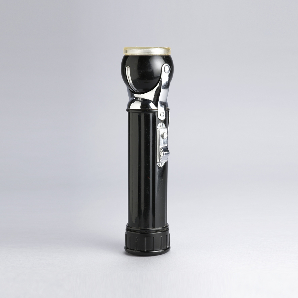 This is a flashlight. It is dated 1941 and we acquired it in 1999. Its medium is plastic, metal. It is a part of the Product Design and Decorative Arts department.