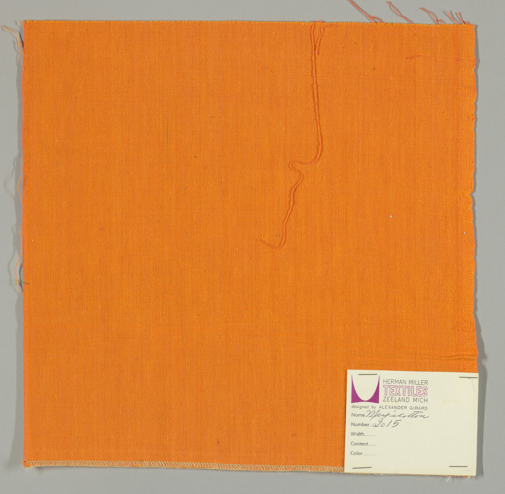 This is a Sample. It was designed by Alexander Hayden Girard and produced by Herman Miller Furniture Company. It is dated 1966 and we acquired it in 1969. Its medium is cotton and its technique is plain weave. It is a part of the Textiles department.