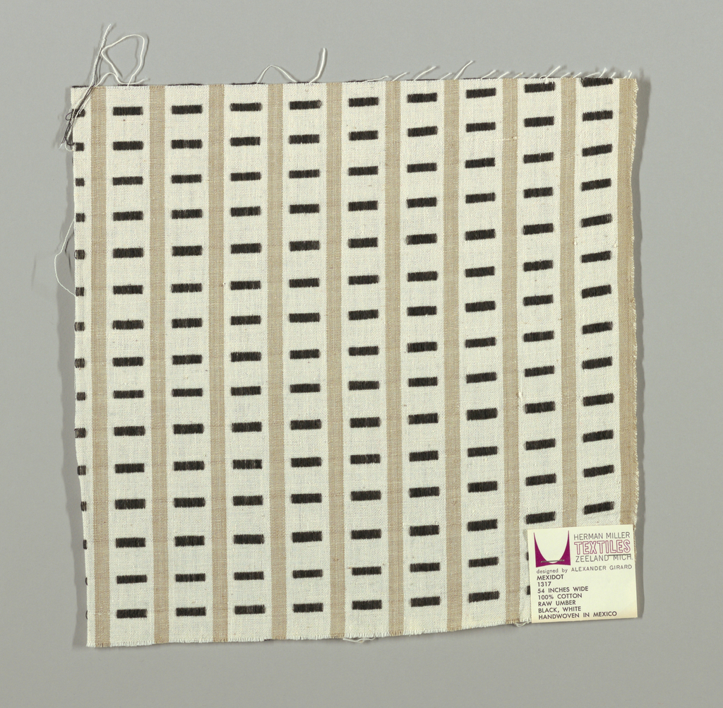 This is a Sample. It was designed by Alexander Hayden Girard and produced by Herman Miller Furniture Company. It is dated 1963 and we acquired it in 1969. Its medium is cotton and its technique is plain weave with supplementary warp patterning. It is a part of the Textiles department.