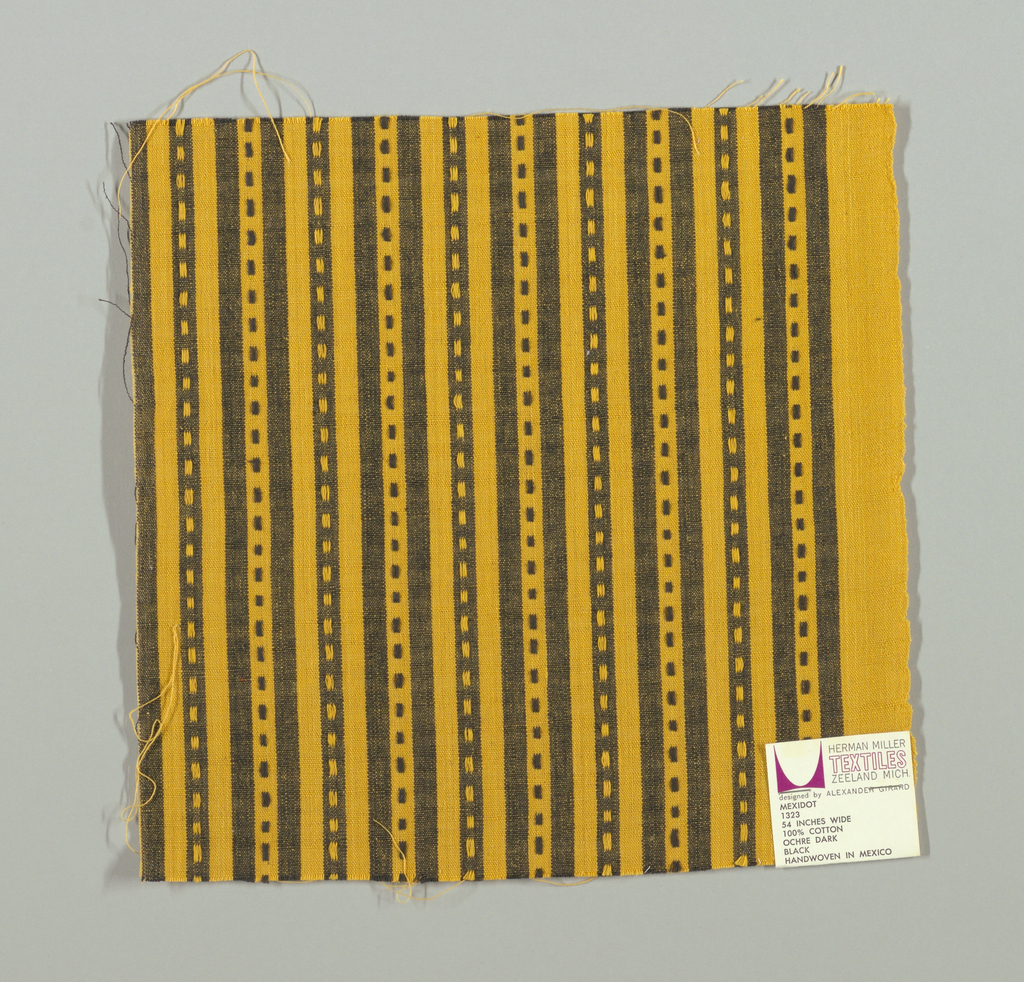 This is a Sample. It was designed by Alexander Hayden Girard and produced by Herman Miller Furniture Company. It is dated 1963 and we acquired it in 1969. Its medium is cotton and its technique is plain weave with supplementary warp patterning. It is a part of the Textiles department.