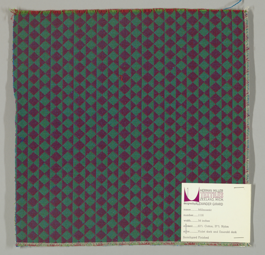 This is a Sample. It was designed by Alexander Hayden Girard and manufactured by Moss Rose Mfg. Co and produced by Herman Miller Furniture Company. It is dated 1960 and we acquired it in 1969. Its medium is cotton (63%) and nylon (37%) and its technique is two intercrossed plain weave structures (double cloth). It is a part of the Textiles department.