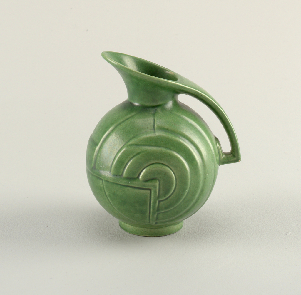 This is a Pitcher. It was manufactured by Carstens-Rheinsberg. It is dated ca. 1930 and we acquired it in 1999. Its medium is glazed earthenware. It is a part of the Product Design and Decorative Arts department.