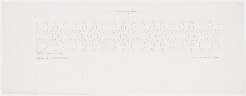 Inscribed in graphite, upper margin: HALF FULL SIZE REPEAT / 24"; in graphite, at left below design: NOTE: / "SEEDS" ARE TO BE COLOR PRINTED / SERIES 715 "PUMPKIN SEEDS"; Verso: in graphite, upper left corner: XII-3