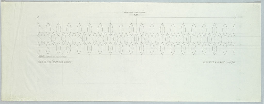Inscribed in graphite, upper margin: HALF FULL SIZE REPEAT / 24"; in graphite, at left below design: NOTE: / "SEEDS" ARE TO BE COLOR PRINTED / SERIES 715 "PUMPKIN SEEDS"; Verso: in graphite, upper left corner: XII-3