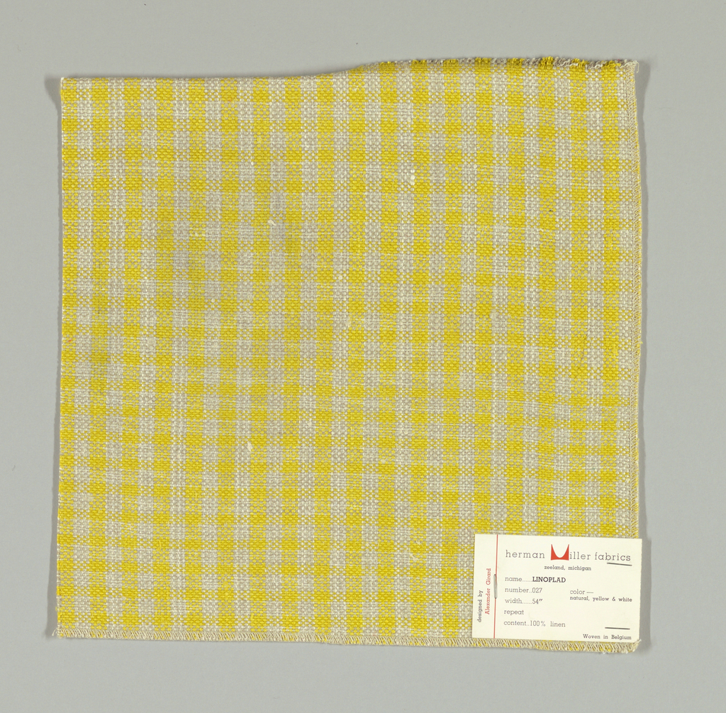This is a Sample. It was designed by Alexander Hayden Girard and produced by Herman Miller Furniture Company. It is dated 1957 and we acquired it in 1969. Its medium is linen and its technique is plain weave. It is a part of the Textiles department.