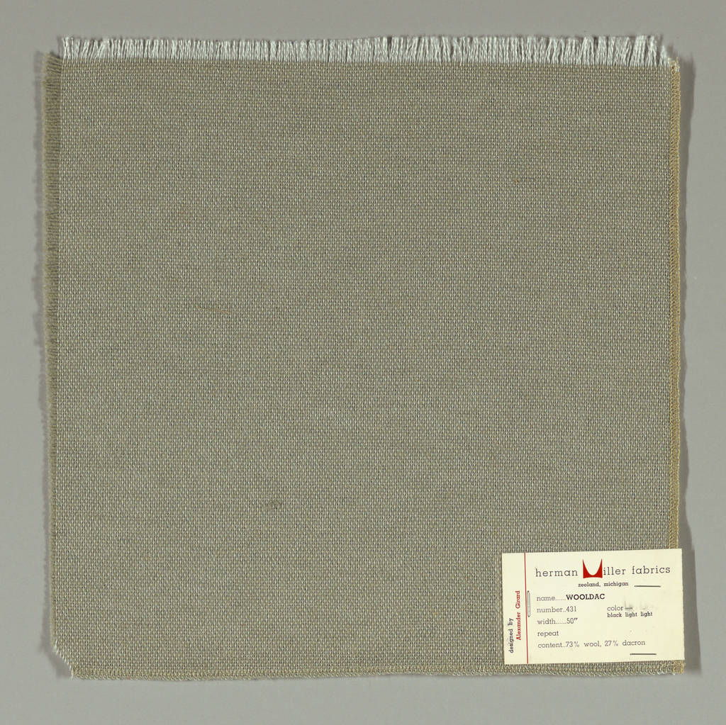 This is a Sample. It was designed by Alexander Hayden Girard and produced by Herman Miller Furniture Company. It is dated 1959 and we acquired it in 1969. Its medium is wool (73%) and dacron polyester (27%) and its technique is plain weave. It is a part of the Textiles department.