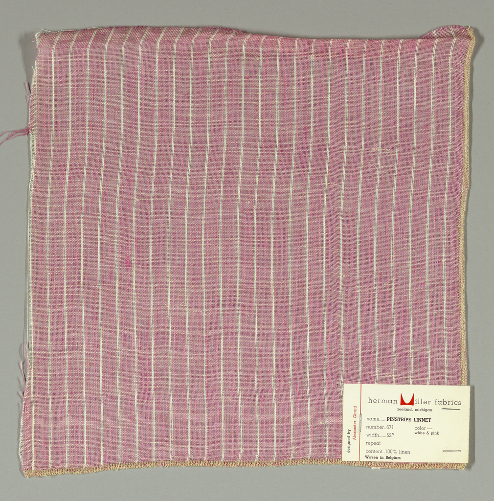 This is a Sample. It was designed by Alexander Hayden Girard and produced by Herman Miller Furniture Company. It is dated 1955 and we acquired it in 1969. Its medium is linen and its technique is plain weave. It is a part of the Textiles department.