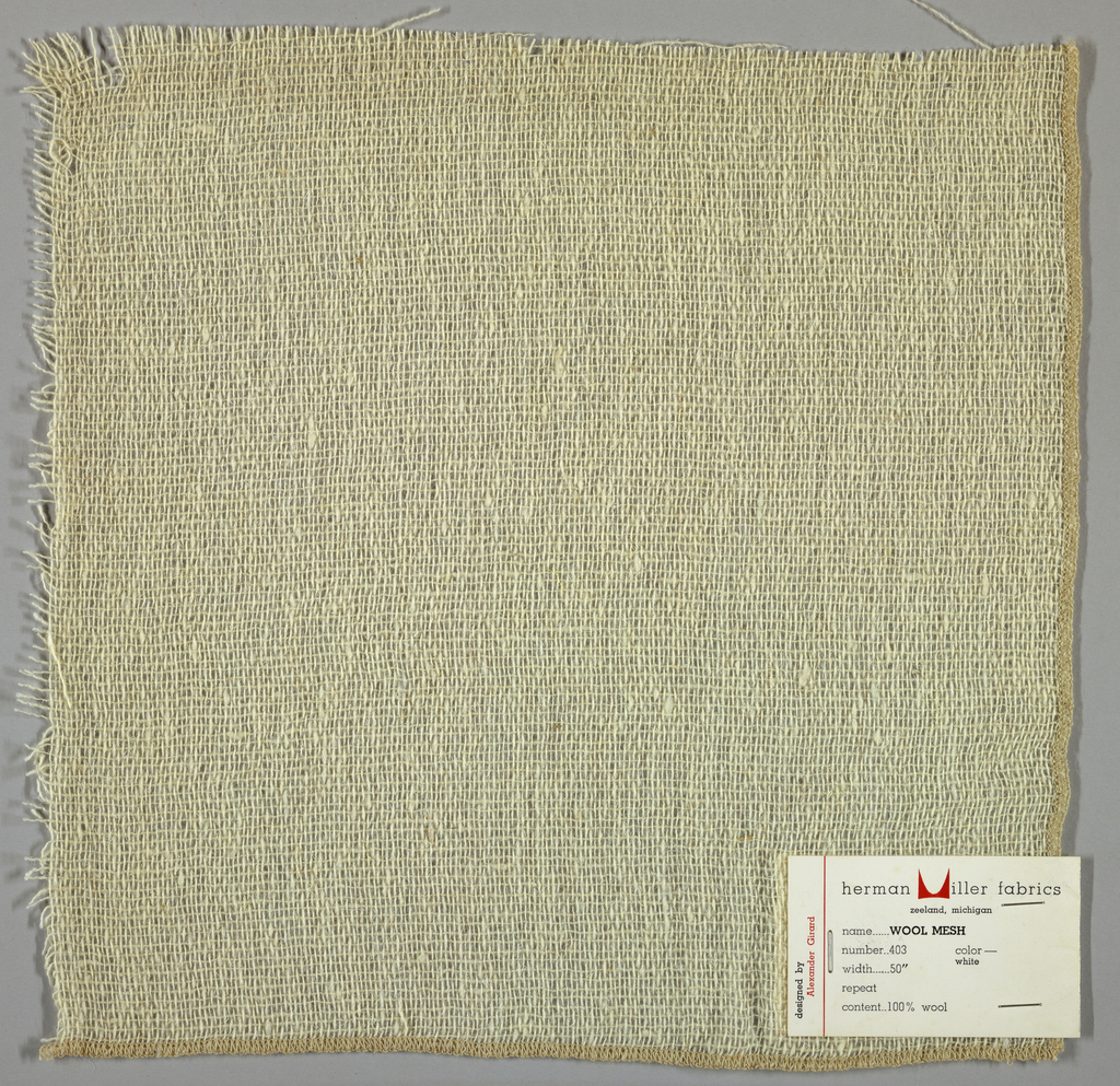 Sample, Wool Mesh; Designed by Alexander Hayden Girard (American, 1907–1993); Produced by Herman Miller Furniture Company (United States); USA; wool; Warp x Weft: 30.5 x 31.8 cm (12 x 12 1/2 in.); Gift of Alexander H. Girard; 1969-165-988