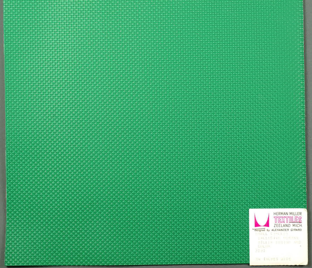 This is a Sample. It was designed by Alexander Hayden Girard and produced by Herman Miller Furniture Company. It is dated 1967 and we acquired it in 1969. Its medium is vinyl-coated cotton (naugahyde) and its technique is cotton knit coated with vinyl and embossed. It is a part of the Textiles department.