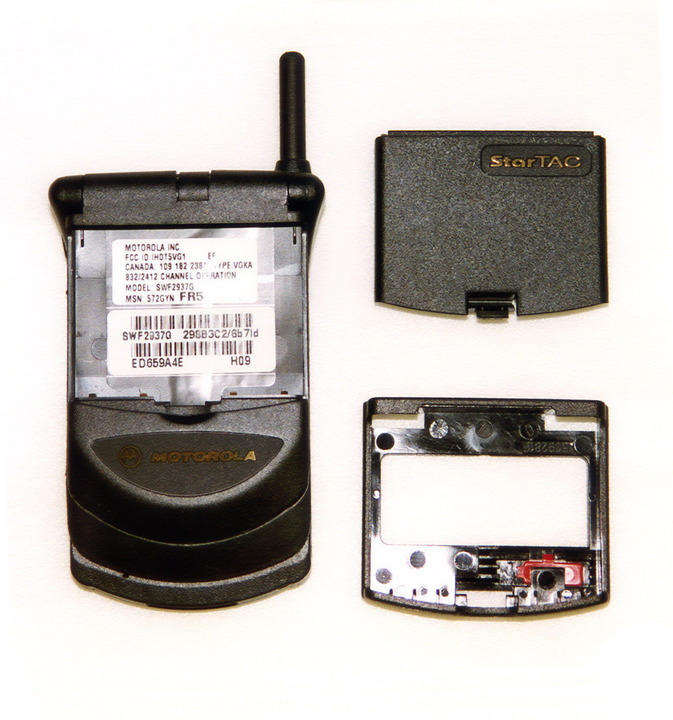 StarTAC™ Cellular Telephone; Manufactured by Motorola, Inc. (United States); USA; injection-molded polycarbonate, metal, electronic components; (a,b: closed): 2.2 x 6 x 12.5 cm (7/8 x 2 3/8 x 4 15/16 in.) (a,b: open): 7.7 x 6 x 14.7 cm (3 1/16 x 2 3/8 x 5 13/16 in.) (c: battery holder): 1.1 x 5.5 x 4.8 cm (7/16 x 2 3/16 x 1 7/8 in.); Gift of Motorola, Inc.; 1999-56-1-a/c