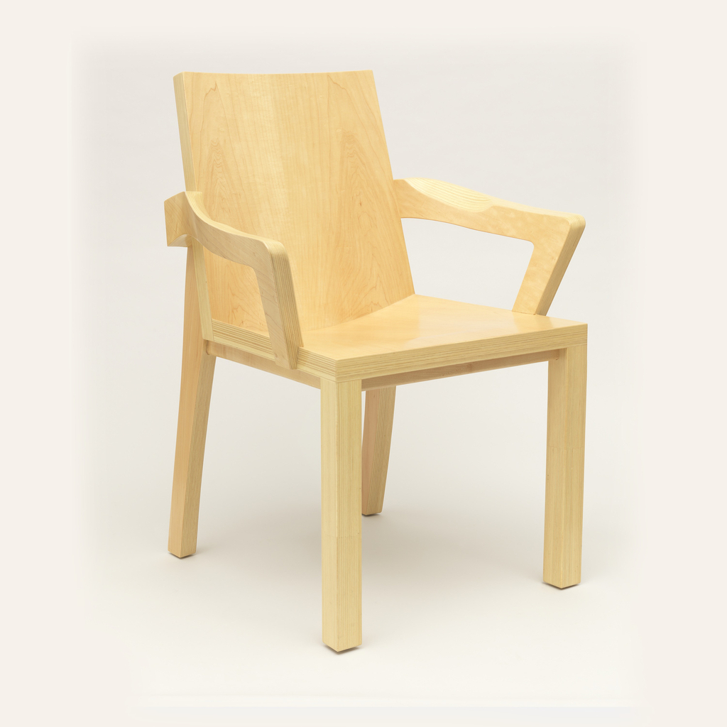 This is a chair. It was designed by Dakota Jackson and produced by Dakota Jackson, Inc.. It is dated design began 1991, introduced 1995 and we acquired it in 1999. Its medium is laminated poplar wood, maple veneer. It is a part of the Product Design and Decorative Arts department.