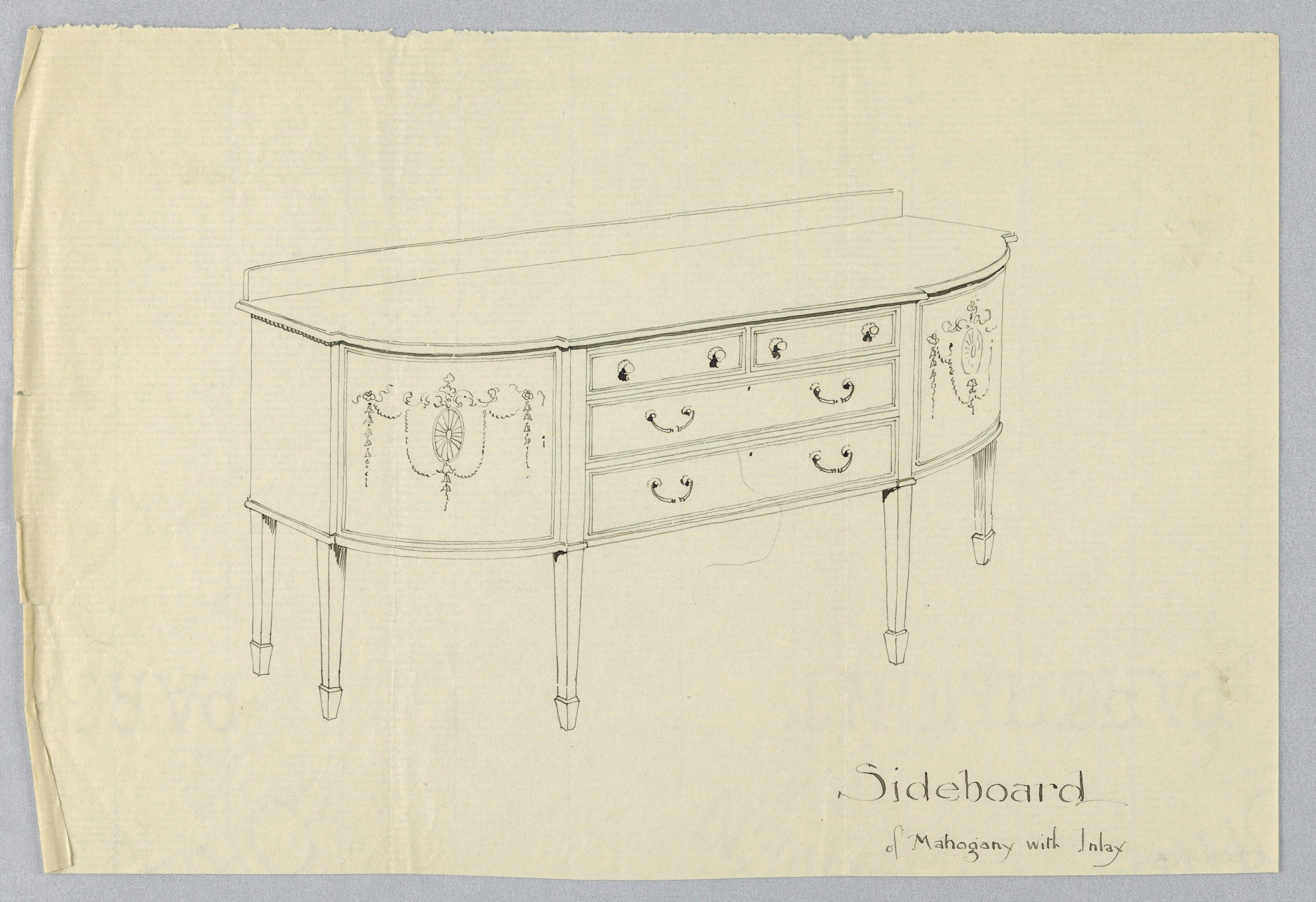 Inscribed in pen and black ink, lower right corner: SIDEBOARD / of Mahogany with Inlay