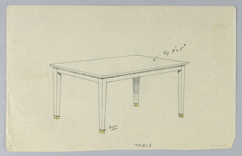 In graphite, at lower center of desigh, with an arrow pointing to the brass sabot: "brass shoe"; in graphite, at upper right of design, with an arrow pointing to table top: numerical notations indicating dimensions; in graphite, at lower right of sheet, along the bottom: "TABLE".