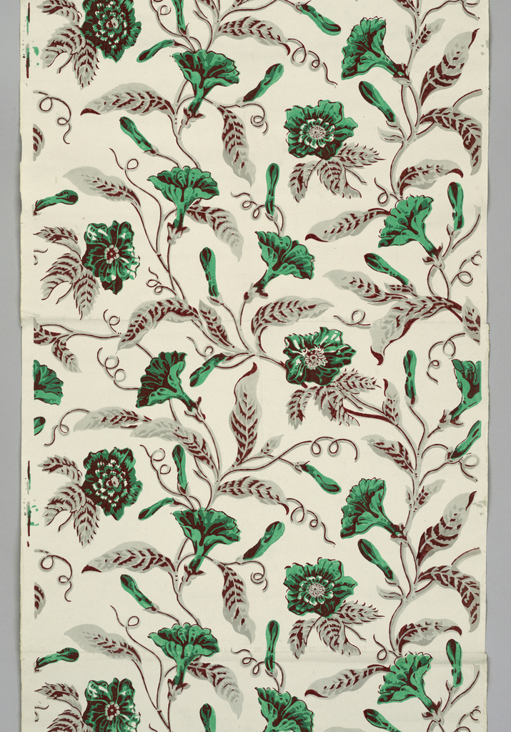 This is a Sidewall. It is dated 1830–40 and we acquired it in 2000. Its medium is block printed on joined sheets. It is a part of the Wallcoverings department.