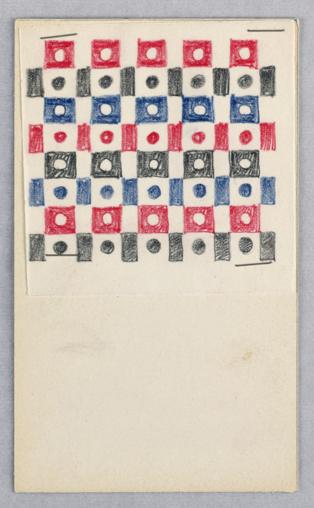 Drawing, Textile Design: Inventory Card; Designed by Alexander Hayden Girard (American, 1907–1993); Office of Herman Miller Furniture Company (United States); USA; red, black, and blue color pencil on white wove paper fastened to white cardboard with four staples; 9.3 x 9.3 cm (3 11/16 x 3 11/16 in.) Mount: 9.8 x 16.4 cm (3 7/8 x 6 7/16 in.); Gift of Alexander H. Girard; 1969-165-422