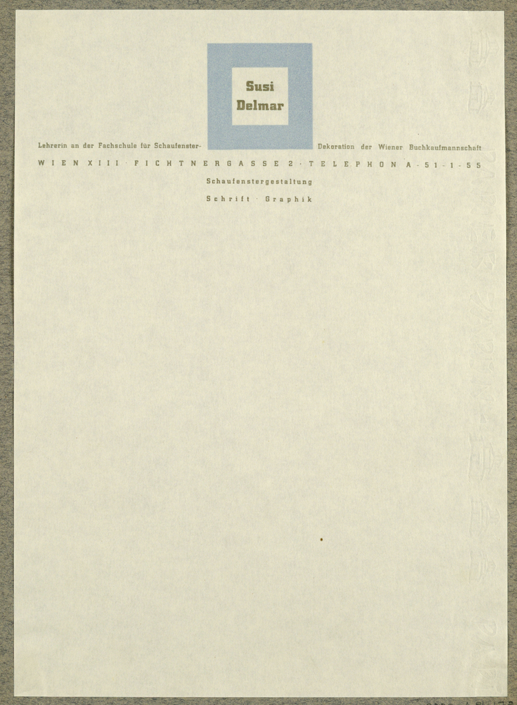 Letterhead, Susi Delmar; Published by Jahoda & Siegel (Austria); letterpress on cream wove paper; Gift of James Howard Fraser; 2000-68-173