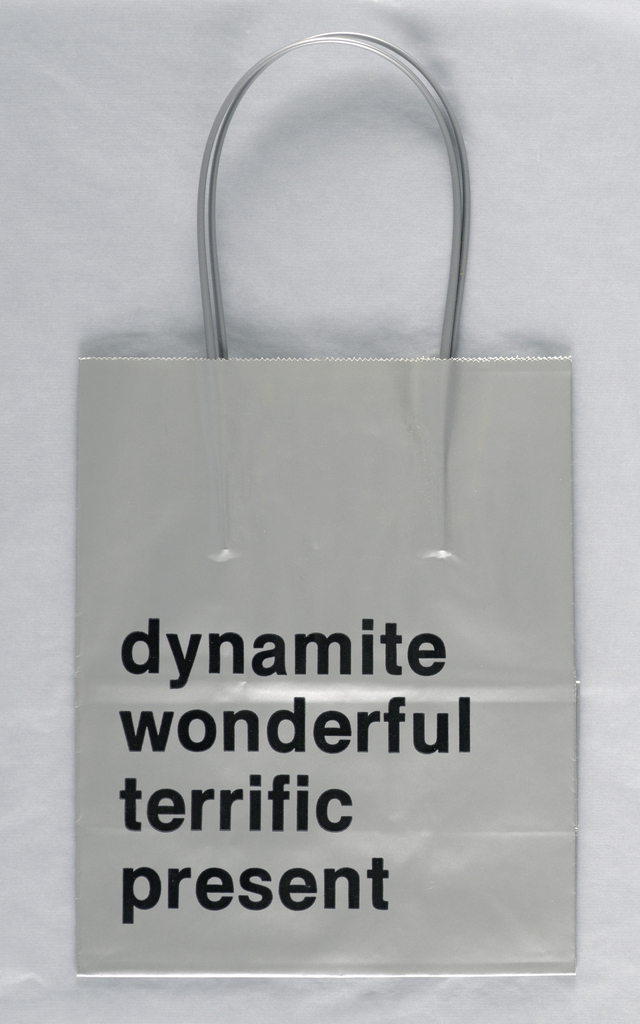 This is a Shopping bag. It is dated 1984 and we acquired it in 2000. Its medium is paper; silver plastic handles. It is a part of the Drawings, Prints, and Graphic Design department.