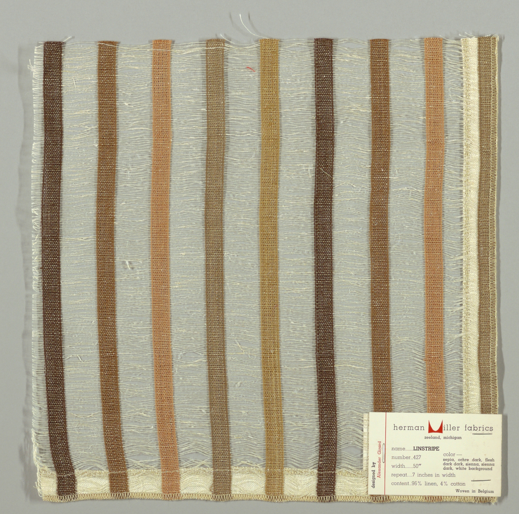 This is a Sample. It was designed by Alexander Hayden Girard and produced by Herman Miller Furniture Company. It is dated 1959 and we acquired it in 1969. Its medium is linen (96%) and cotton (4%) and its technique is vertical bands of plain weave joined by long weft floats. It is a part of the Textiles department.