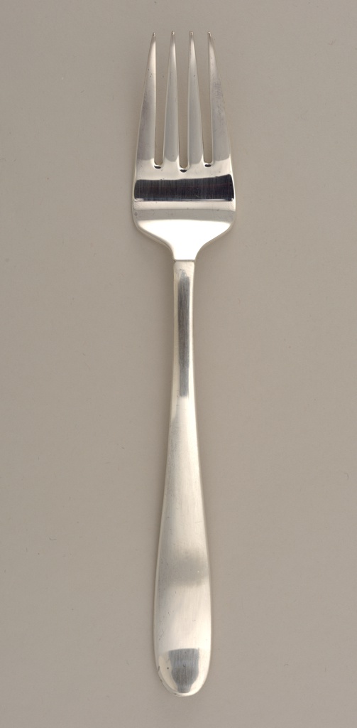 This is a fork. It was designed by Theresia Hvorslev and manufactured by Mema Guld Och Silver AB and made for (as the client) SAS [Scandinavian Airlines System]. It is dated 1967 and we acquired it in 2002. Its medium is silver-plated stainless steel. It is a part of the Product Design and Decorative Arts department.
