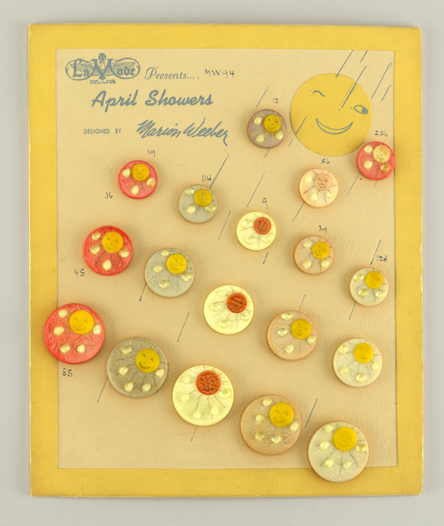 April Showers Button Display Card Display Card; Designed by Marion Weeber Welsh (1905–2000); Manufactured by B. Blumenthal & Co.; USA; cardboard (display), celluloid (buttons); Bequest of Marion Weeber Welsh; 2006-2-36