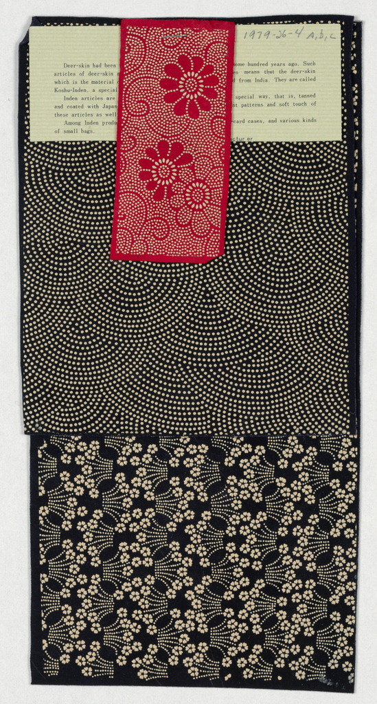 This is a Stenciled felt (Koshu-inden). It is dated 1900–1979 and we acquired it in 1979. Its medium is wool and its technique is lacquer applied to felt through punched (tsuki-bori) stencil to one side of felt. It is a part of the Textiles department.