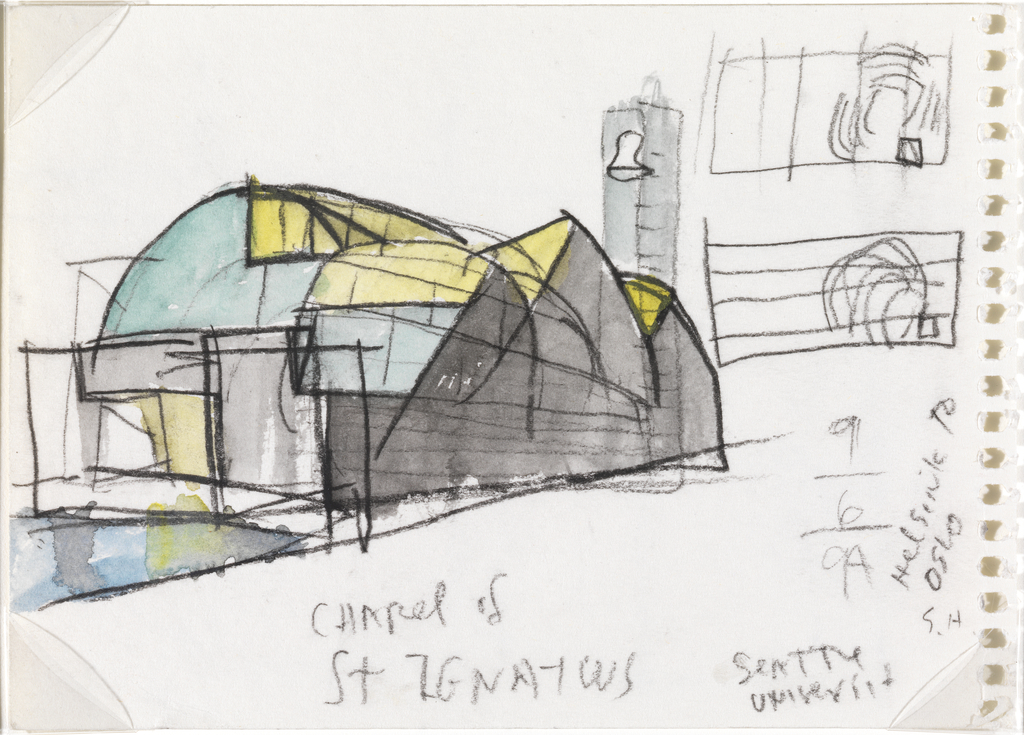Holl’s Chapel of St. Ignatius at Seattle University received the 1995 NYC AIA Design Award and the 1997 National AIA Religious Architecture Award. Holl’s concept for the chapel began as “a gathering of different lights.” Holl intended this architectural concept to: serve as a metaphor for spiritual enlightenment and the teachings of St. Ignatius; refer to the different nationalities of students brought together at Seattle University, which is a Jesuit school; and be a literal interpretation of the metaphysical properties of light to reflect, refract, or cast diaphanous veils as he created his “chromatic spaces" (the space revealed by reflected, colored lights or light passing through colored windows and skylights). His sketched spaces indicate a billowing up with light emanating from unseen sources (within the roof and ceiling). As indicated in this drawing, radiant colored light (cast from stained glass windows, hidden light sources, or skylights) shines into the structure, forming what Holl calls "chromatic spaces." In the actual building, these brilliant color accents infuse the interiors with glowing light; the radiance of the inner (holy) space emanates and projects outdoors, thereby distinguishing this building from its secular surroundings on the campus.