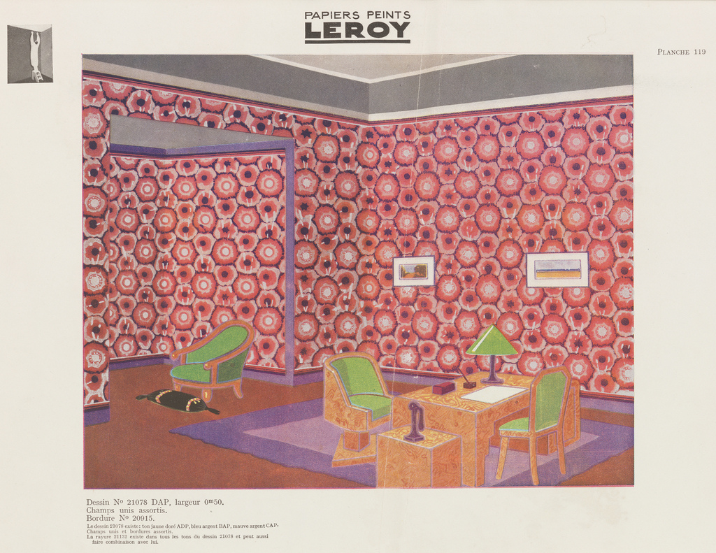 This is one of 60 machine-printed samples proposed for acquisition. These papers were at one time part of a larger sample booked issued by the Isidore Leroy Company in Paris and date to approximately 1930. Leroy was one of the first French wallpaper companies to turn to machine printing. In 1858, they patented a process to improve the transfer of color on surface prints. Throughout the 19th century, the firm’s reputation was equal to that of the Zuber et Cie. During the 1920s, the firm continued to produce high quality wallpapers with designs by René Crevel, Robert Duflos, Emile-Alain Séguy, and Henri Stephany. One of Séguy’s designs is included in this collection. His use of bold color and naturally-inspired forms is evident in his design of a kingfisher seated on a branch.