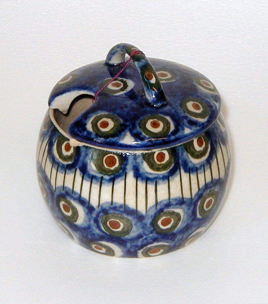 This is a Sugar bowl and lid. It was manufactured by Julius Paul & Sohn. It is dated ca. 1930 and we acquired it in 2002. Its medium is glazed earthenware. It is a part of the Product Design and Decorative Arts department.