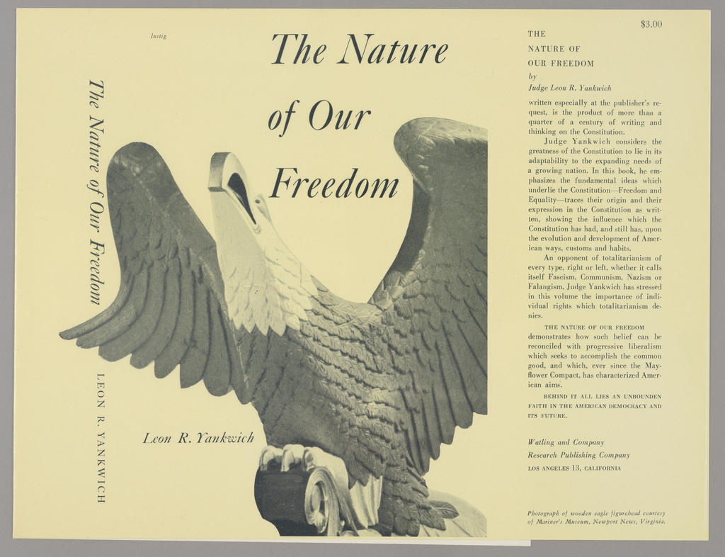 Printed in black ink, front cover upper right: The Nature/Of Our/Freedom; lower left: Leon R. Yankwich. Printed vertically in black ink, side cover: The Nature Of Our Freedom LEON R. YANKWICH. Printed in black ink, inside flap of front cover: $3.00/THE/NATURE OF/OUR FREEDOM/by/Judge Leon R. Yankwich/written specially at the publisher’s re-/quest, is the product of more than a/quarter of a century writing and/thinking on the Constitution./Judge Yankwich considers the/greatness of the Constitution to lie in its/adaptability to the expanding needs of/a growing nation. In this book, he em-/phasizes the fundamental ideals which/underlie the Constitution – Freedom and/Equality – traces their origin and their/expression in the Constitution as writ-/ten, showing the influence which the/Constitution has had, and still has, upon/the evolution and development of Amer-/ican ways, habits, and customs./An opponent of totalitarianism of/any type, right or left, whether it calls/itself Fascism, Communism, Nazism or/Falangism, Judge Yankwich has stressed/in this volume the importance of indiv-/idual rights which totalitarianism de-/nies./THE NATURE OF OUR FREEDOM/demonstrates how such a belief can be/reconciled with progressive liberalism/which seeks to accomplish the common/good, and which, ever since the May-/Flower Compact, has characterized Amer-/ican aims./BEHIND IT ALL LIES AN UNBOUNDEN/FAITH IN THE AMERICAN DEMOCRACY AND/ITS FUTURE./Watling and Company/Research Publishing Company/Los Angeles 13, California/Photograph of wooden eagle figurehead courtesy/of Mariner’s Museum, Newport News, Virginia. Printed in black ink, inside flap of back cover: The Author, Judge Leon A. Yank-/wich, has had an unusual career as a law-/yer, teacher of law, writer and judge./After a successful period as a practicing/lawyer, with began with his admission/to the Bar before attaining his majority,/he was appointed Judge of the Superior/Court of Los Angeles County Califor-/nia, in 1927 by Governor C. C. Young./Thereafter, he was twice elected to that/office, in 1928 and 1934, and in 1935/was appointed a Judge of The United/States District Court by President Frank-/lin D. Roosevelt, a position which he/has held ever since./Throughout his entire career, in ad-/dition to opinions which have gained/him national recognition, he has written/articles and books on a wide variety of/topics./In 1928, in a child custody case, he/spoke the now famous words, “There/are no illegitimate children; only illegi-/timate parents.”/His writing, while scholarly, has/unusual clarity and simplicity, due in/part to his long association with the/press. EDITOR AND PUBLISHER when re-/cently speaking of his latest book, “It’s/Libel or Contempt if You Print It,” (1950), called it “blessedly clear.”