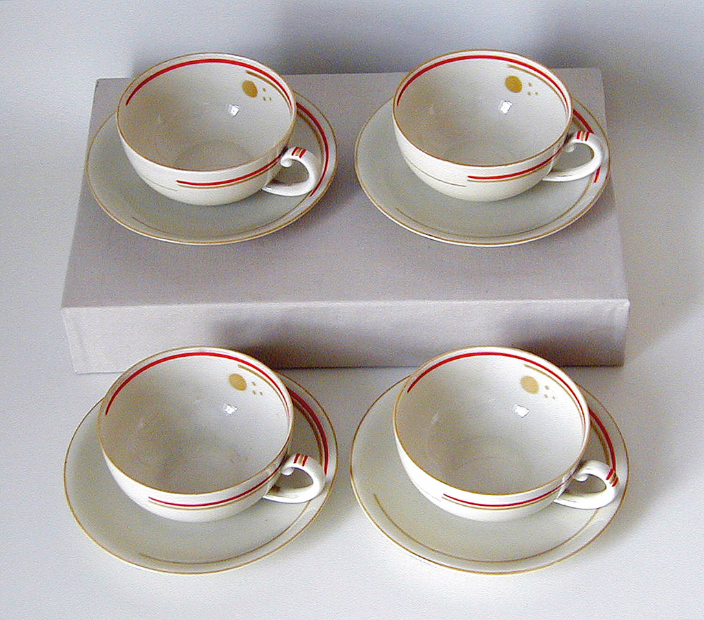 This is a cup and saucer. It was manufactured by Zeh, Scherzer & Co.. It is dated ca. 1930 and we acquired it in 2002. Its medium is glazed porcelain. It is a part of the Product Design and Decorative Arts department.
