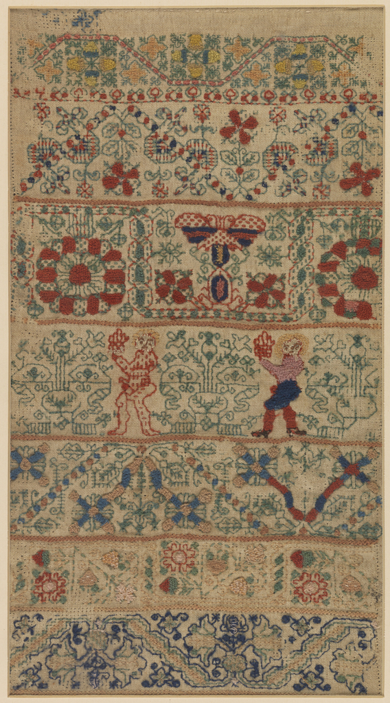 This is a Sampler. It is dated 17th century and we acquired it in 2003. Its medium is wool embroidery on linen foundation and its technique is embroidered on plain weave. It is a part of the Textiles department.