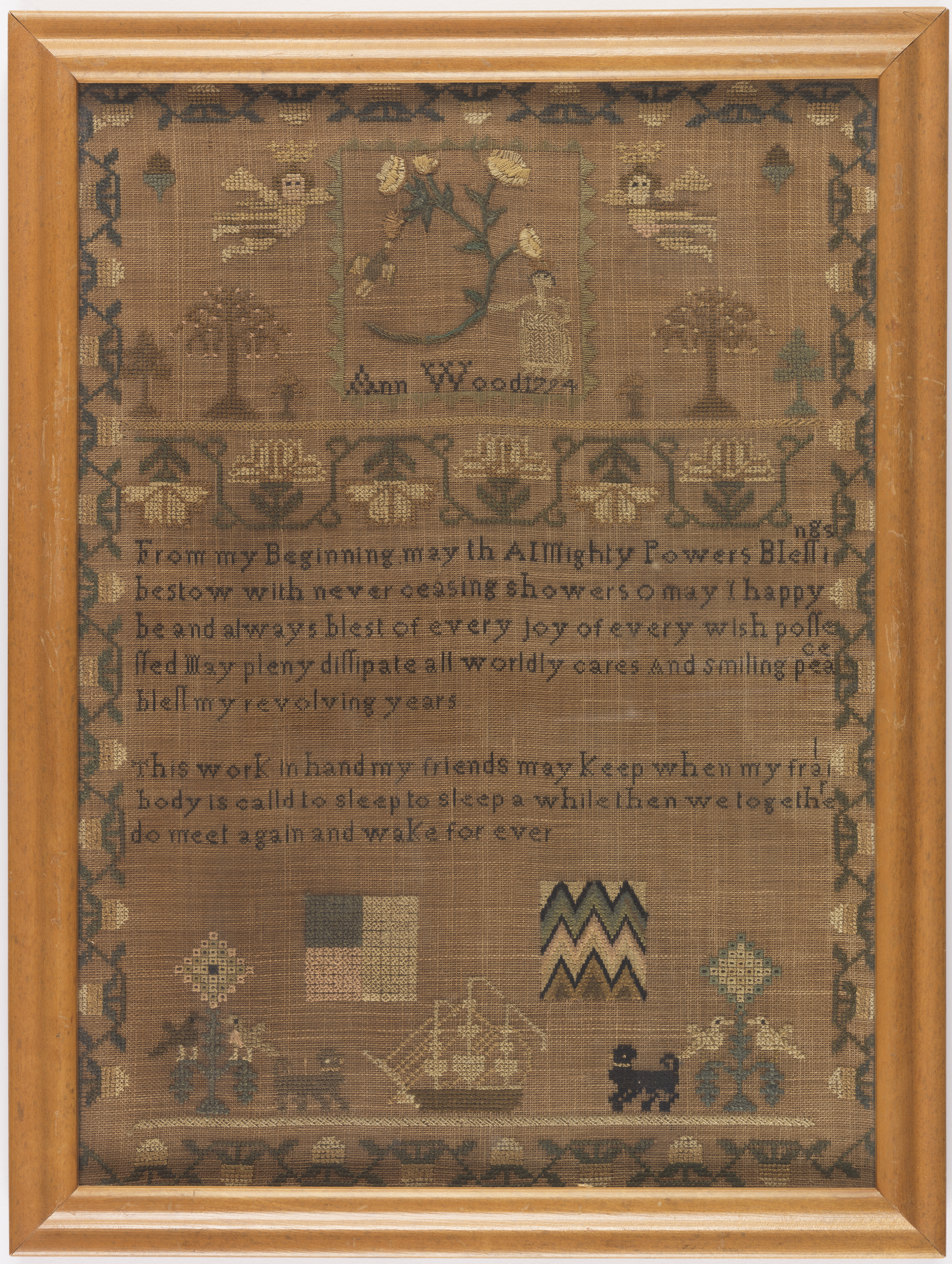 Sampler (USA); Made by Ann Wood (American); silk embroidery on linen foundation; Frame H x W: 48.3 x 36.8 cm (19 x 14 1/2 in.); Gift of Myra and William H. Mathers; 2003-14-7