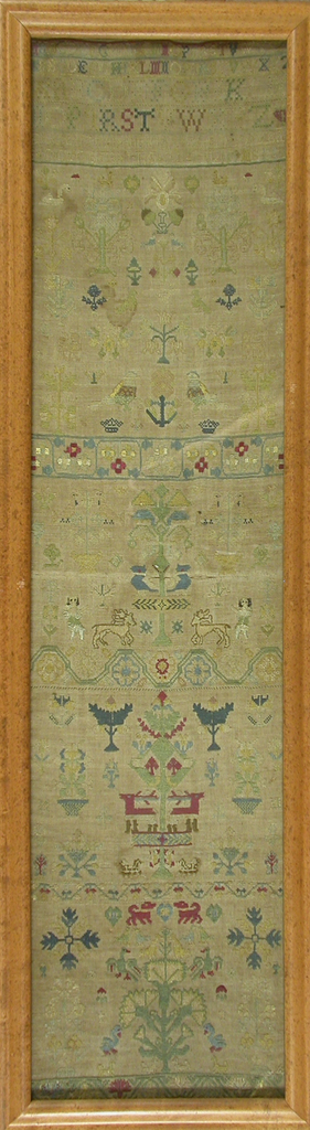 Sampler (England); Made by Elizabeth Saggar (English); linen, silk; Frame H x W x D: 88.9 x 25.4 cm (35 x 10 in.); Gift of Myra and William H. Mathers; 2003-14-33