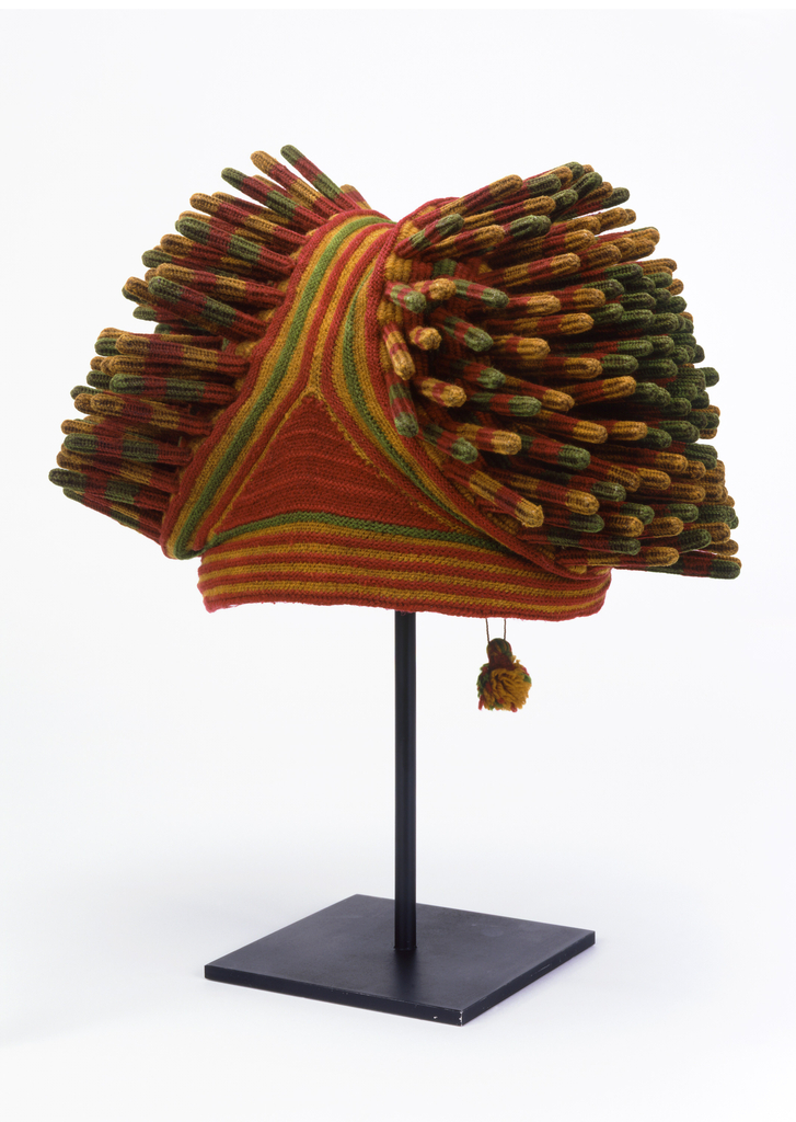 The museum has a small collection of African hats primarily made out of raffia with a basket-weave technique. This Cameroon hat, however, represents a very different technique: crocheted wool with wood-reinforced burls. Not only is it stylistically different, but it is also geographically distinctive from other, similar hats in the collection, most of which originate from Zaire (known today as the Democratic Republic of the Congo). This proposed acquisition also adds to the museum’s larger collection of men’s and women’s hats spanning several centuries and continents that most often relates to the technique of embroidery.