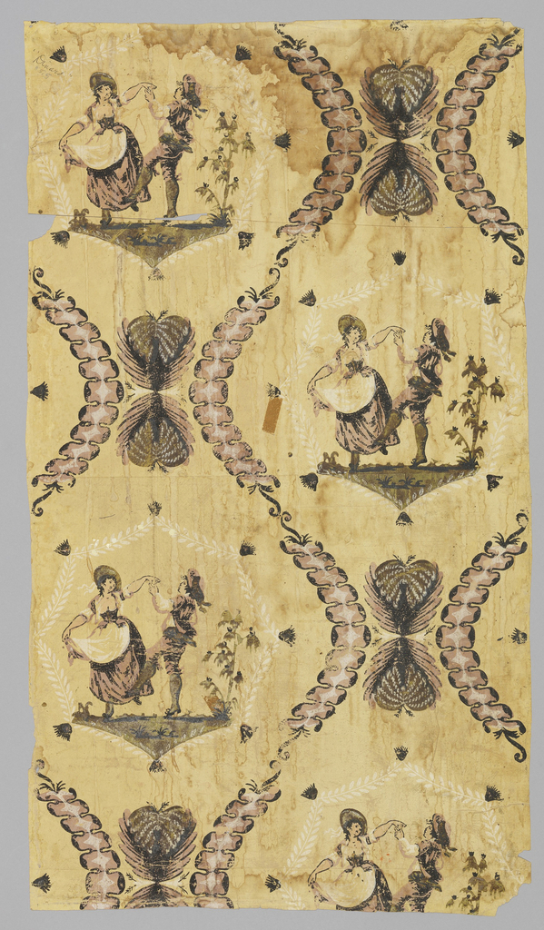 Sidewall (France); block-printed on joined sheets; a) Overall: 69 x 50 cm (27 3/16 x 19 11/16 in.) b) 21 x 50 cm; Gift of The Museum at The Fashion Institute of Technology; 1998-75-158-a,b