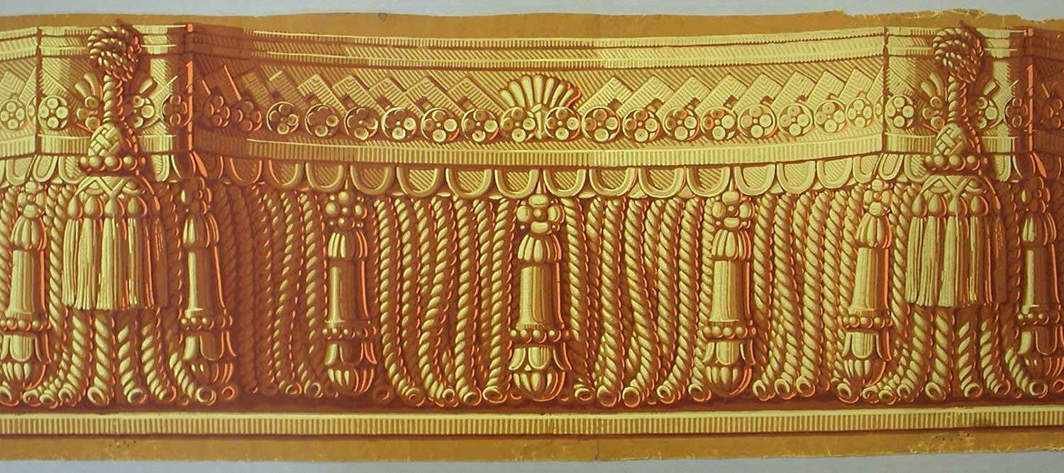 This is a Border. It was designed by Xavier Mader and manufactured by Joseph Dufour et Cie.. It is dated 1815 and we acquired it in 1998. Its medium is block printed on handmade paper. It is a part of the Wallcoverings department.