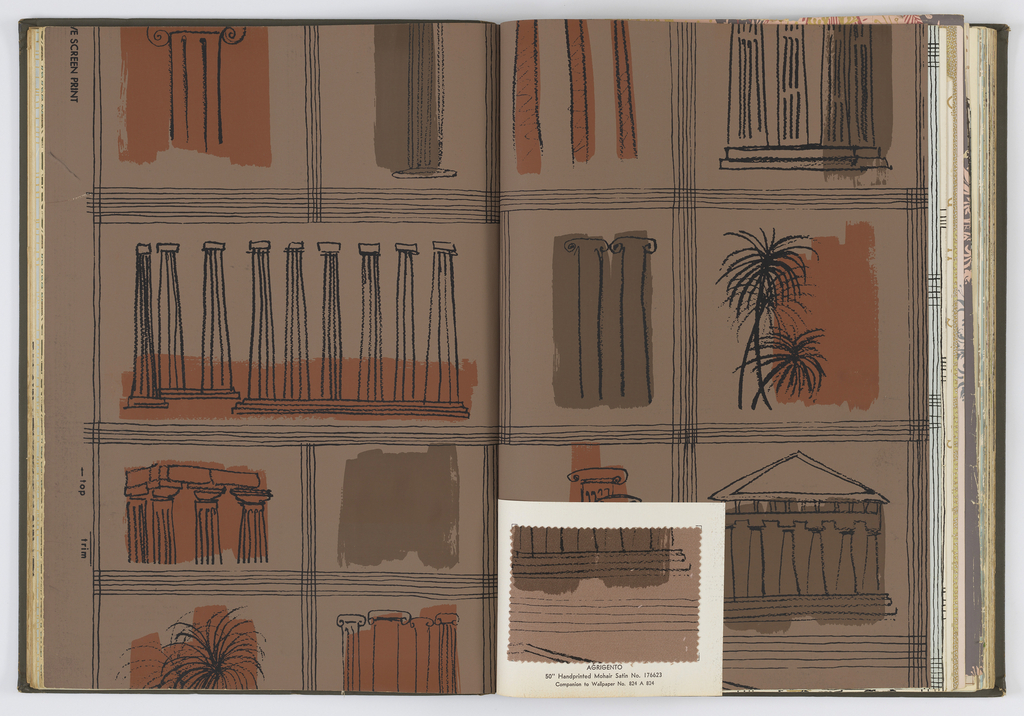 This is a Sample book. It was manufactured by F. Schumacher & Co.. It is dated 1950–59 and we acquired it in 1998. Its medium is screen printed. It is a part of the Wallcoverings department.