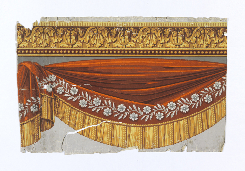This is a Border. It is dated 1810–20 and we acquired it in 1998. Its medium is block-printed and flocked on handmade paper. It is a part of the Wallcoverings department.