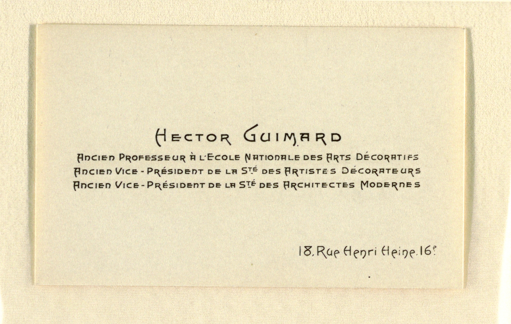 Printed in black ink, center: HECTOR GUIMARD / ANCIEN PROFESSEUR À L'ECOLE NATIONALE DES ARTS DÉCORATIFS / ANCIEN VICE-PRÉSIDENT DE LA STÉ DES ARTISTES DÉCORATEURS / ANCIEN VICE-PRÉSIDENT DE LA STÉ DES ARCHITECTES MODERNES; lower right: 18, Rue Henri Heine.16.p