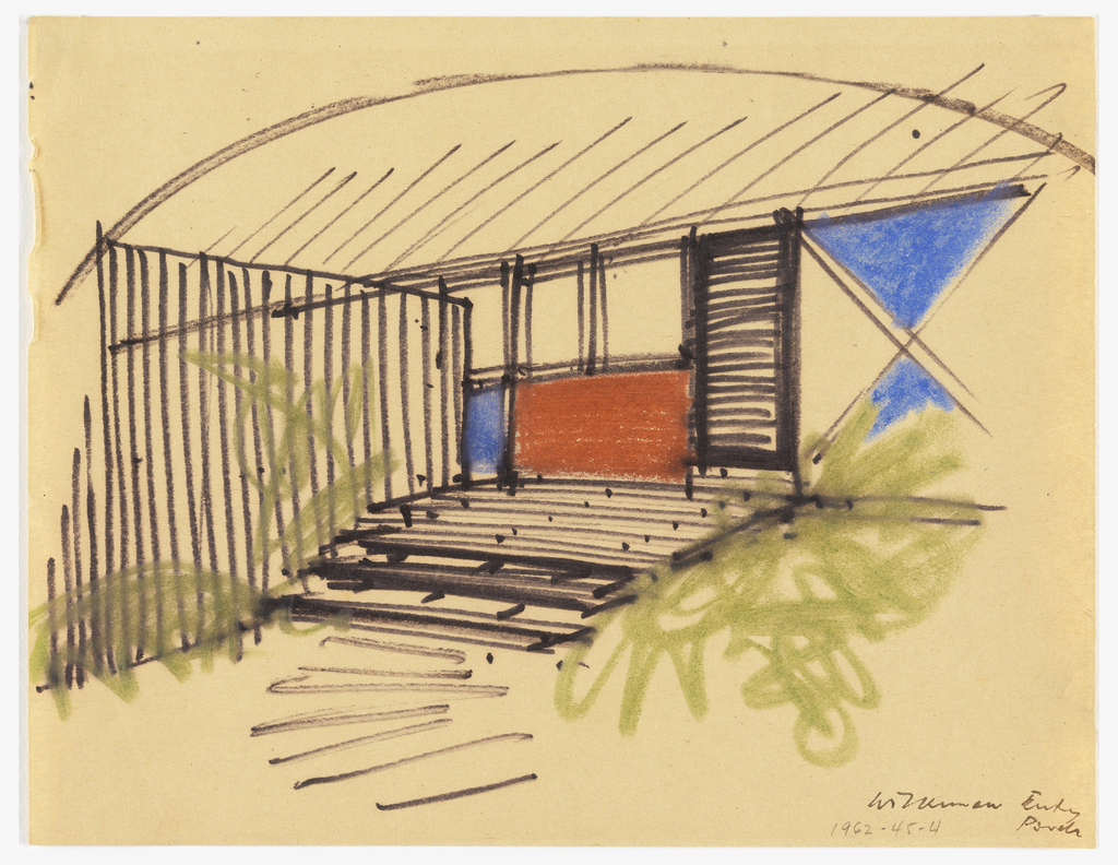 Drawing, Entrance Detail of Proposed Cottage for Kirk Wilkinson, Wellfleet, MA; Serge Ivan Chermayeff (American, b. Grozny, Chechnya 1900–1996); USA; brush and ink, crayon on paper; 21.6 x 27.8 cm (8 1/2 x 10 15/16 in.); Gift of Serge Ivan Chermayeff; 1962-45-4