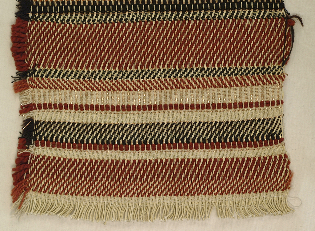 This is a Sample. It was designed by Julia McVicker and Else Regensteiner (American, b. Germany, 1906 – 2003) and manufactured by reg/wick Hand Woven Originals. It is dated ca. 1948 and we acquired it in 2006. Its medium is cotton, cotton boucle, wool, rayon, and lurex and its technique is bands of twill and plain weave. It is a part of the Textiles department.