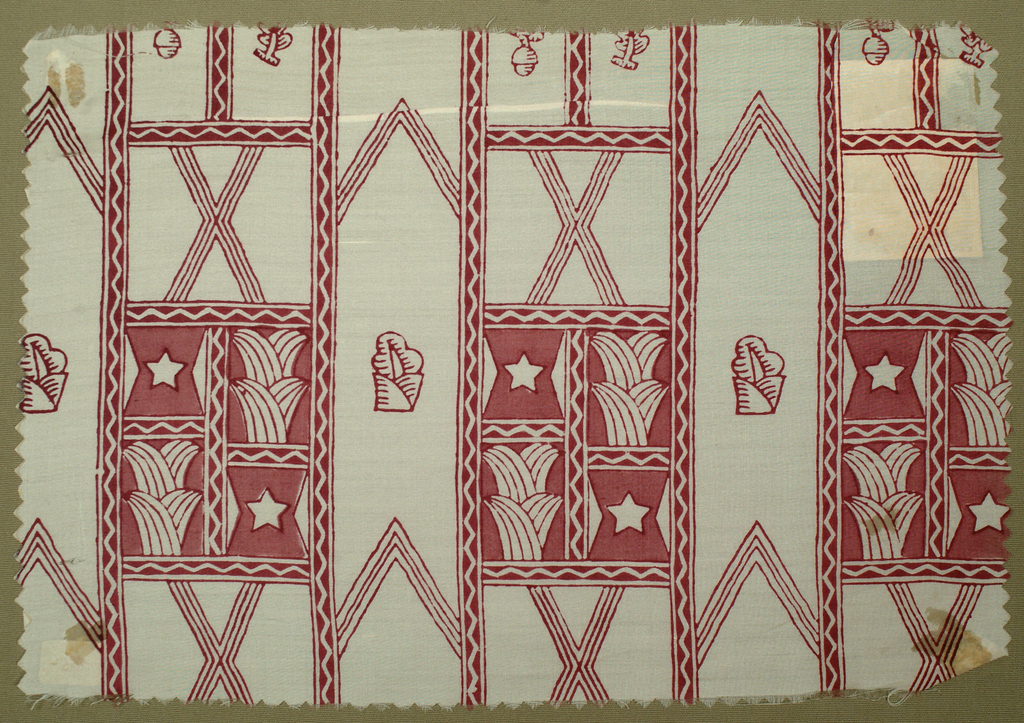 This is a Textile. It was designed by Josef Hoffmann and made for Wiener Werkstätte. It is dated 1910–17 and we acquired it in 2005. Its medium is silk and its technique is block printed on plain weave. It is a part of the Textiles department.