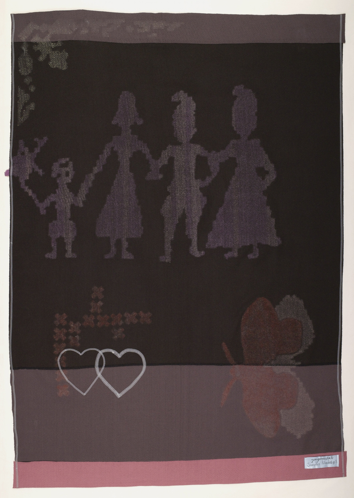 Each work in this series is inspired by designs found on historic samplers in the museum’s Textiles department. Embroidered samplers are one of the richest areas of the collection: the department has over 1,000 examples from all over the world. Jongerius visited the collection three times between 2003 and 2004 and viewed hundreds of samplers. Jongerius was interested in the learning process inherent in the making of these objects, the historic use and reuse of established motifs, and the highly personal symbols and information contained within samplers.