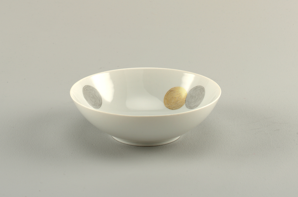 Exquisit (shape), Coins (pattern) Bowl; Designed by Raymond Loewy (American, b. France, 1893–1986); Manufactured by Rosenthal Aktiengesellschaft (Germany); Germany; glazed porcelain, gilding; H x diam.: 5.3 x 17.5 cm (2 1/16 x 6 7/8 in.); Gift of Paul Walter; 2006-11-7