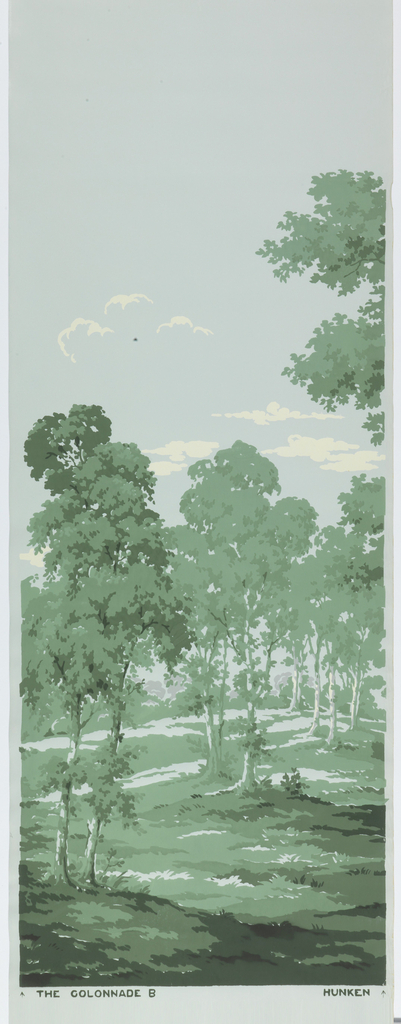 Colonnade is a good example of a mid-20th-century scenic wallpaper. Designed in the historic style, it contains a classic landscape scene with architectural monuments placed throughout. This paper was produced by the George J. Hunken Company, which operated from 1912 to 1956 in Brooklyn, New York. Hunken produced a wide range of scenic papers as well as repeating patterns, and began printing scenics as early as 1931. One characteristic feature of Hunken papers is the combination of screenprinting with airbrushing. This unusual and rare combination of techniques was used on many—if not all—of the Hunken scenics.