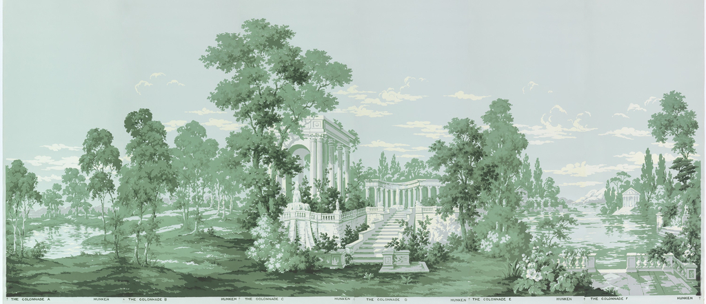 Colonnade is a good example of a mid-20th-century scenic wallpaper. Designed in the historic style, it contains a classic landscape scene with architectural monuments placed throughout. This paper was produced by the George J. Hunken Company, which operated from 1912 to 1956 in Brooklyn, New York. Hunken produced a wide range of scenic papers as well as repeating patterns, and began printing scenics as early as 1931. One characteristic feature of Hunken papers is the combination of screenprinting with airbrushing. This unusual and rare combination of techniques was used on many—if not all—of the Hunken scenics.