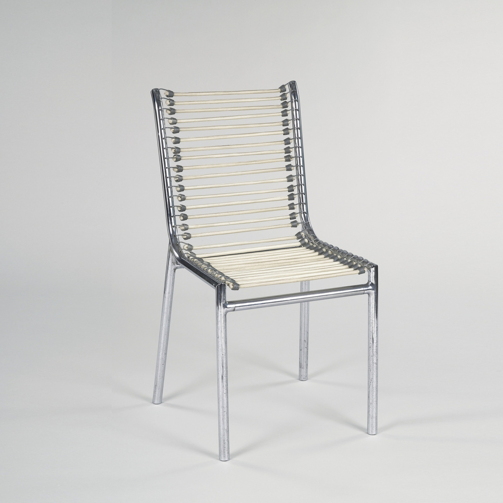 This spare, minimalist design is part of a series executed in 1928–29. The inclusion of bungee cord-like elastic bands for the seat and back, normally reserved for luggage racks and sports equipment of the period, make the chair a very early example of the application of such materials in seating design.