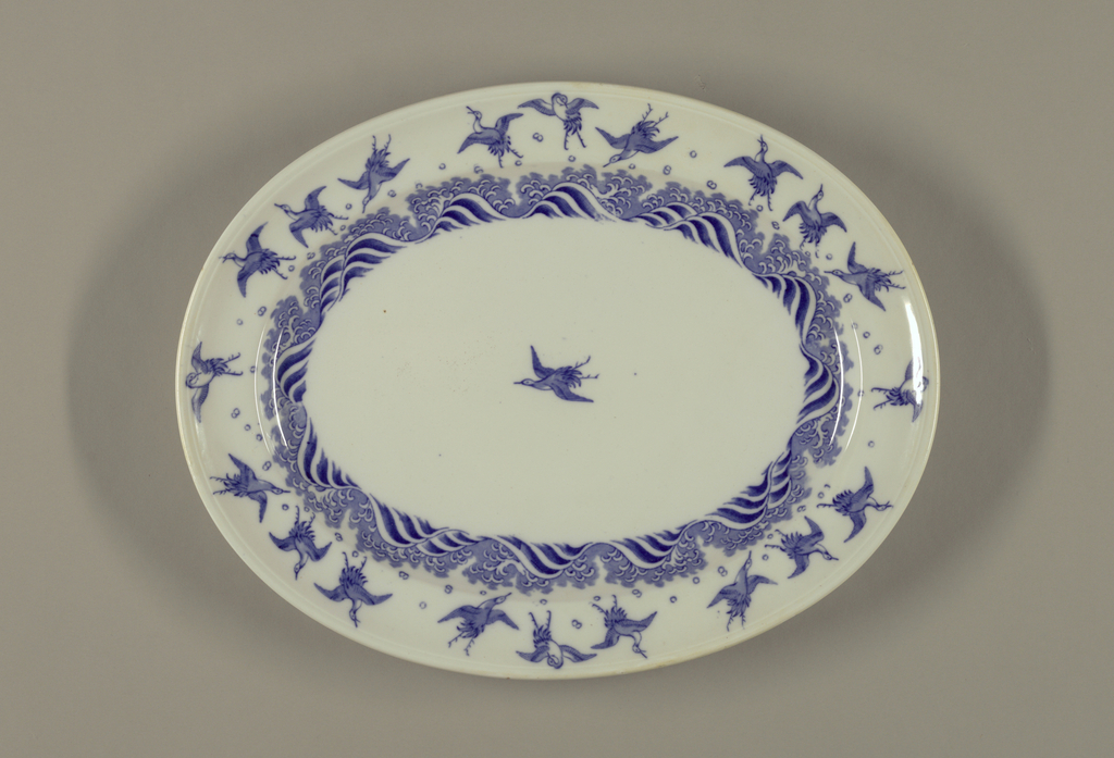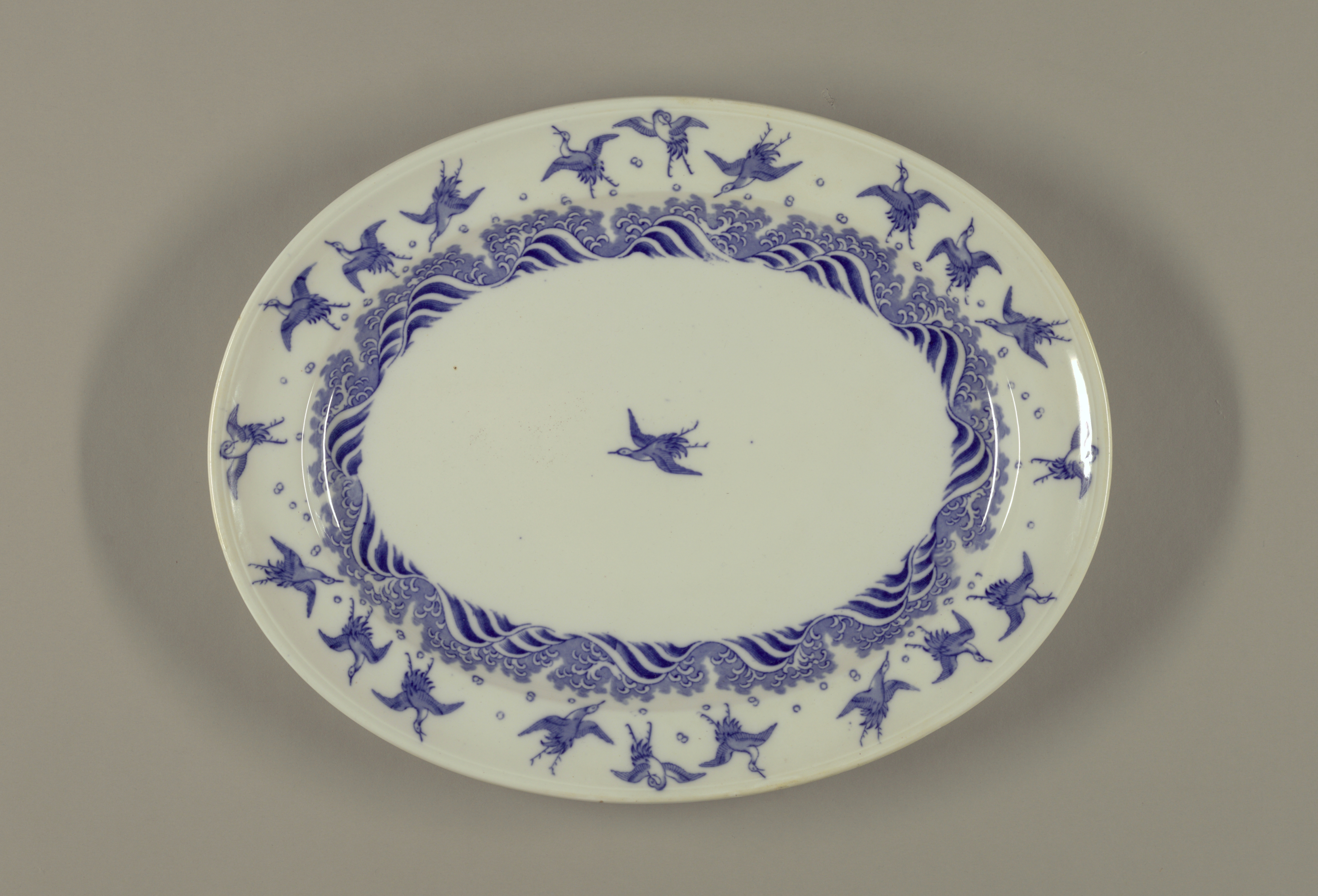 In 1872 Dresser registered with Mintons a pattern of flying cranes in the form of a circle, presumably for a plate. This large platter likely derives from this pattern and is one of a number of pieces that Mintons produced featuring this popular Japanese imagery.